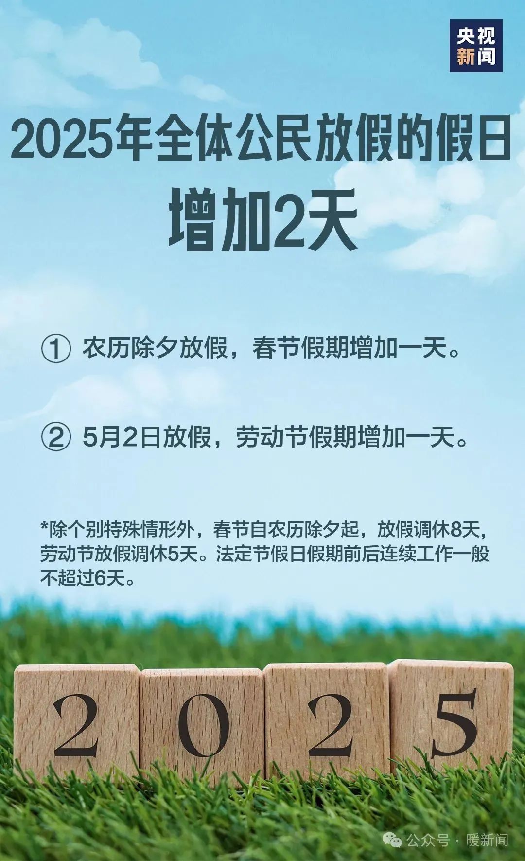 ? 全體公民放假的假日增加2天,即農(nóng)歷除夕、5月2日。增加后,春節(jié)放假4天(農(nóng)歷除夕、正月初一至初三),勞動(dòng)節(jié)放假2天(5月1日、2日)。放假總天數(shù)從11天增加至13天。